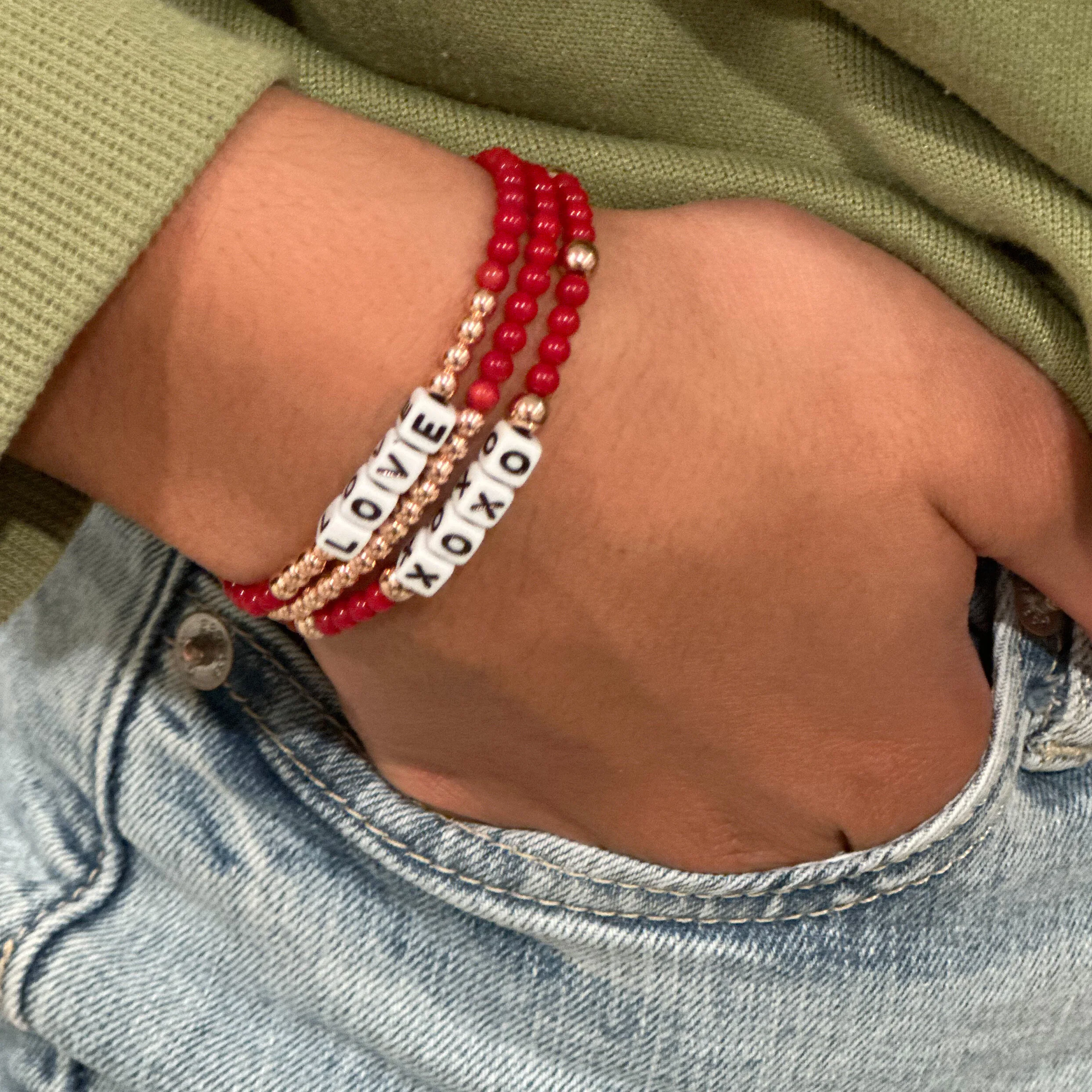 Get these red hot bracelets made with all the love. Wear as a trio or share them with someone special. Handmade beading includes: Bamboo Coral, Rose Gold Hematite, and Cubed Letter Beads. Save 10% when buying the full stack.